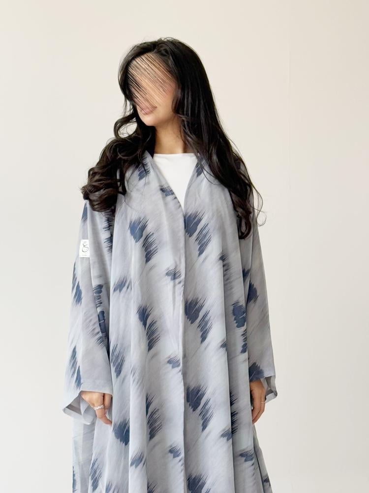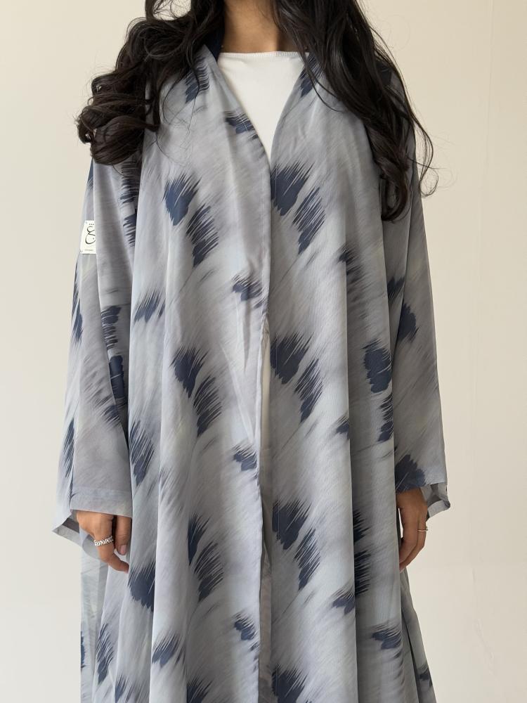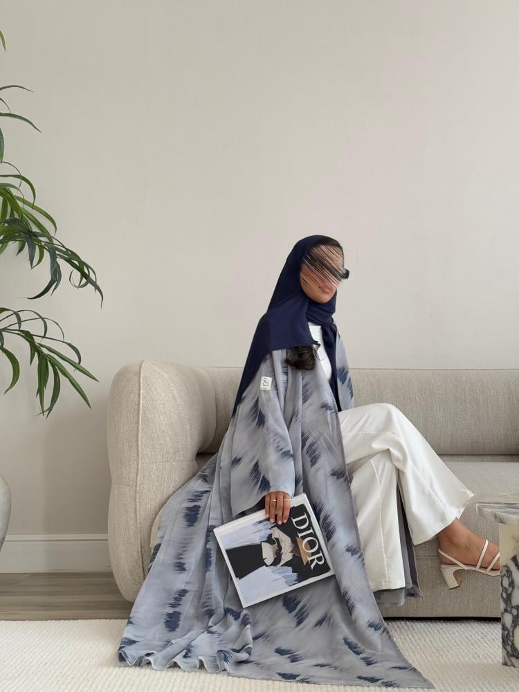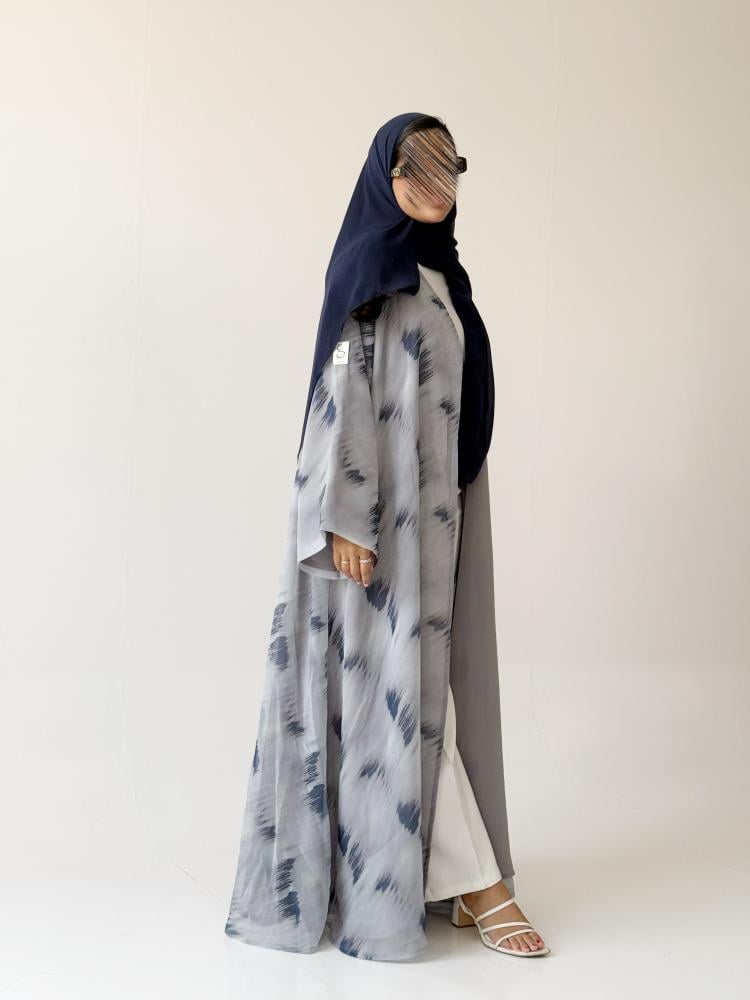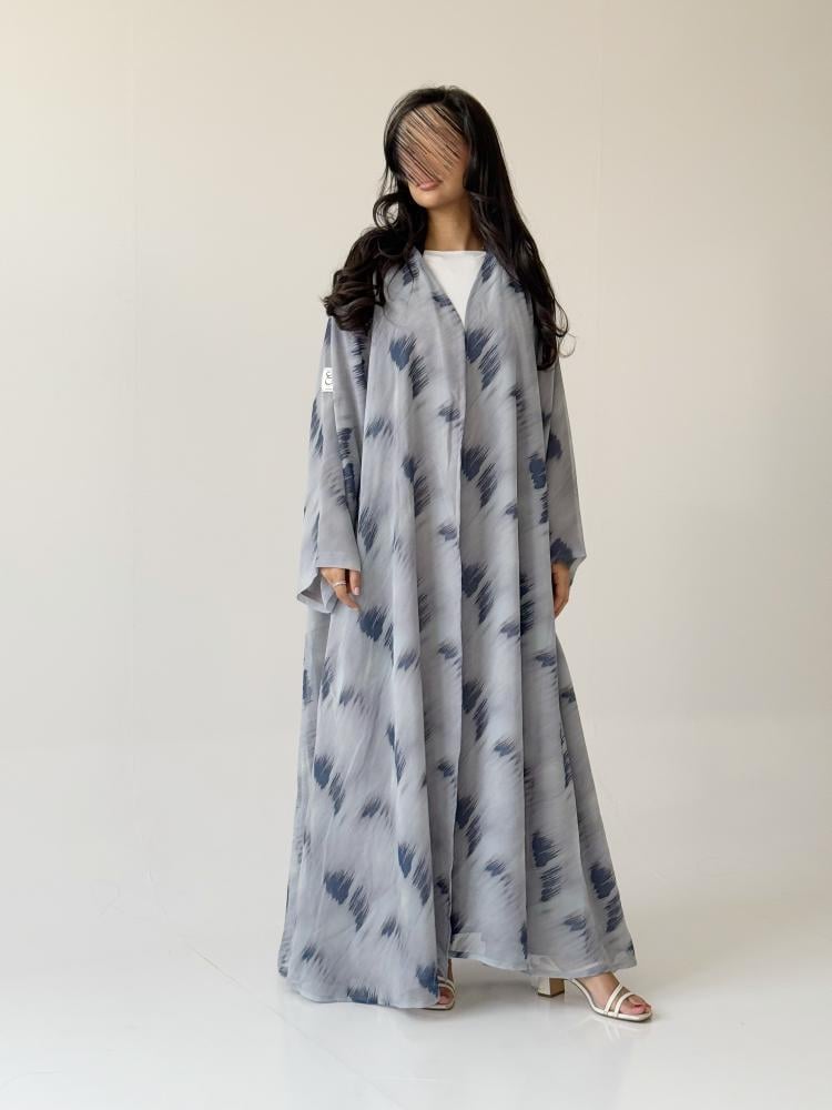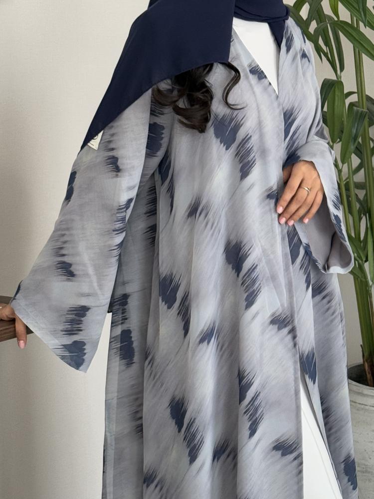 خامة العباية: شيفون مبطن لون العباية رمادي مع كحلي ،